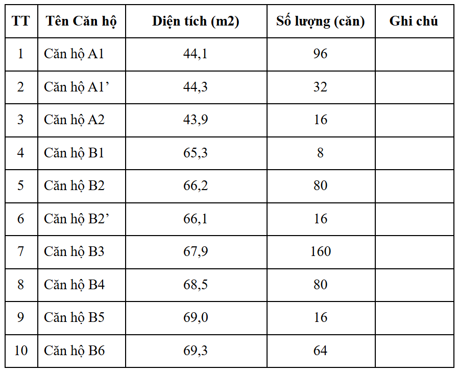 7. Số lượng căn hộ đối với từng loại căn hộ: